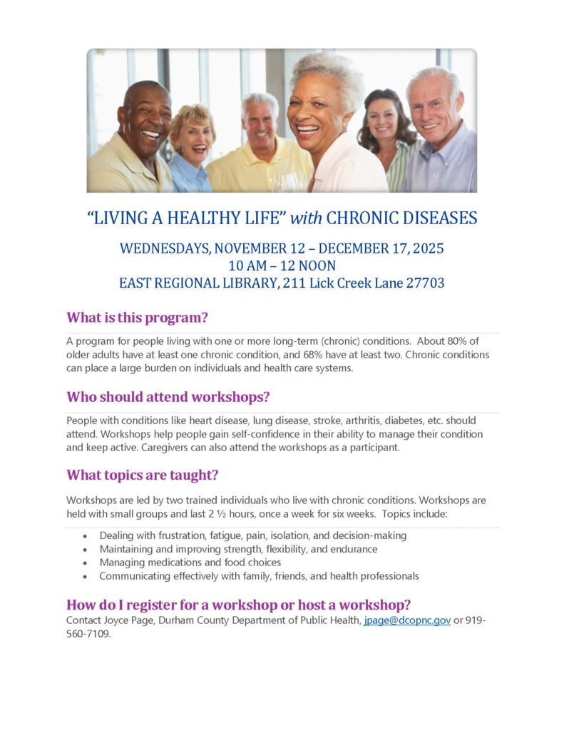 About 80% of older adults have one at least 1 chronic disease. If you want to learn more about how to manage your health, keep active and get connected to peers; join the “Living a Healthy Life with Chronic Diseases workshops being held at the East Regional Library from November 12th-December 17th. To register contact Joyce Page, Durham County Department of Public Health, at jpage@dconc.gov or (919)-560-7109.