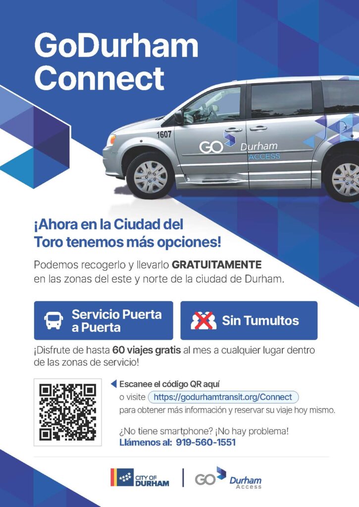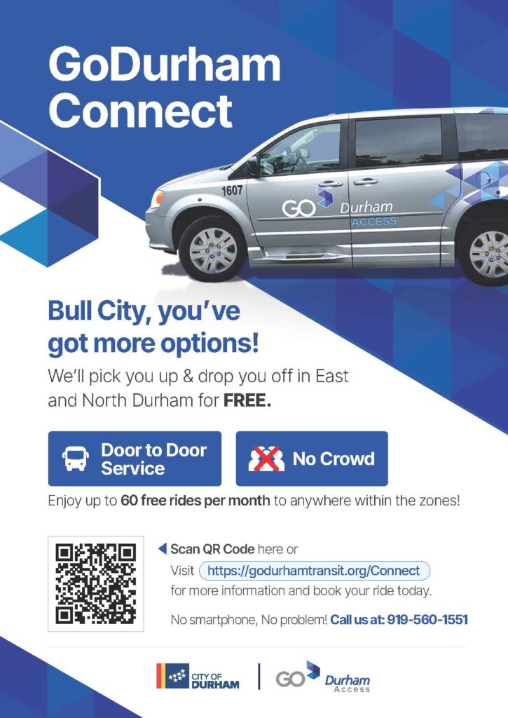 GoDurham Connect is a new resource for getting us around town! It is a flexible ride service that takes us where we need to go within the North or East Durham Zones. You can request a same-day ride in a sedan, minivan or 12-passenger van. Please visit the GoDurham Connect page for more information including an interactive map to check if an address is in the two zones – https://godurhamtransit.org/news/godurham-connect