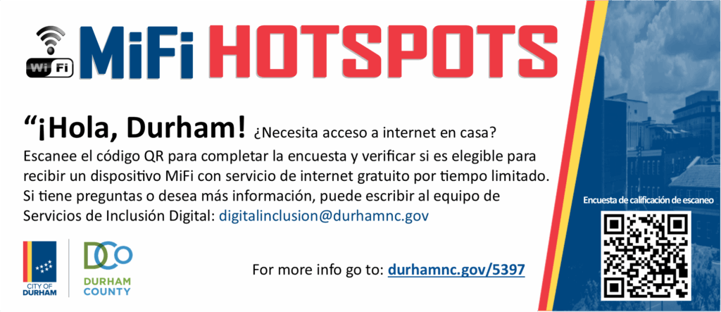 La Ciudad de Durham ha lanzado el Programa de Distribución de MiFi, que ofrece acceso gratuito a internet para los residentes que califiquen. El programa proporcionará servicio de internet gratuito por un tiempo limitado y los participantes podrán quedarse con el dispositivo. Para obtener más información sobre el Programa de Distribución de MiFi, visite durhamnc.gov/5397 o escanee el código QR en el volante para completar la encuesta de calificación.