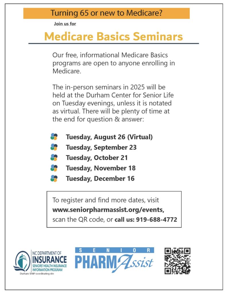 Medicare Open Enrollment ends on December 7th. If you are turning 65 or are new to Medicare, join Senior PharmAssist for their Medicare Basics Seminar starting on Tuesday, August 26th. The first session will be virtual. The rest of the seminars will be held in-person at the Durham Center for Senior Life on Tuesday evenings. To register, visit Senior PharmAssist’s website – www.seniorpharmassist.org/events, scan the QR code on the flyer, or call them at 919-688-4772.