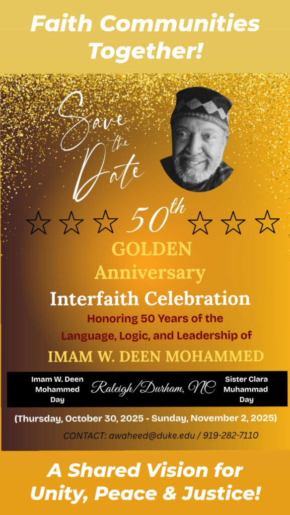 Thursday, October 30th-Sunday, November 2nd: SAVE the DATE to participate in the 50th anniversary of of Imam W. Deen Mohammad. This is an interfaith event. To register, send an email to awaheed@duke.edu or call (919) 282-7110.