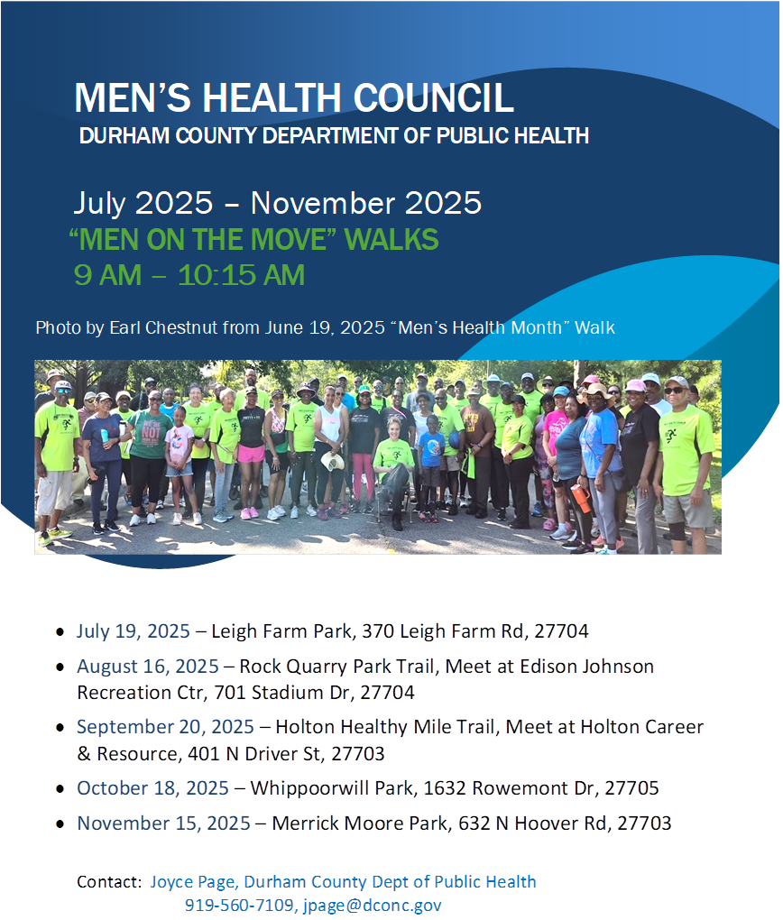 July-November 2025 – Durham Men’s Health Council “Men on the Move” Walks – Please join the Men’s Health Council for monthly walks from July until November. August’s walk is on Saturday, August 16th at Rock Quarry Park Trail. (Meet at Edison Johnson Recreation Center at 701 Stadium Dr.).The walks begin at 9am. Everyone is welcome to the walks! For more information, contact Joyce Page with the Durham County Department of Public Health at 919-560-7109 or email her at jpage@dconc.gov.