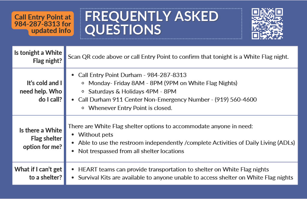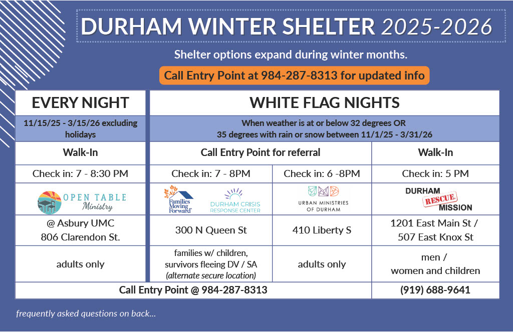 November 10, 2025 – The Durham Community Safety Department has activated the “white flag” for this evening. This means that some local programs are providing additional shelter beds to individuals and families who are experiencing homelessness. White flag activation occurs when the weather is: