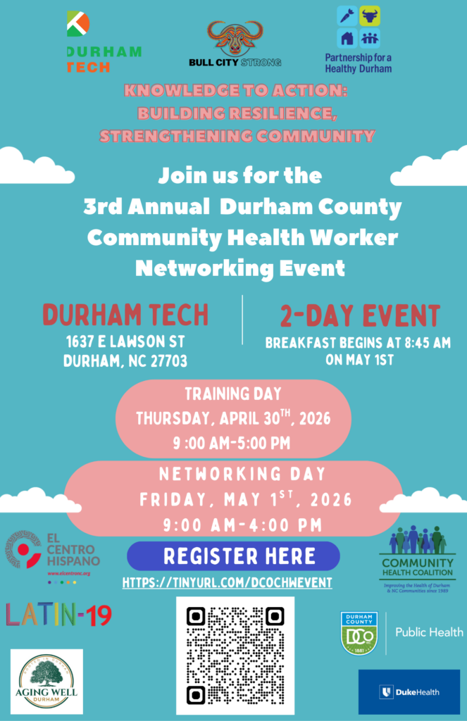 April 30th and May 1st – 3rd Annual Durham Community Health Worker Networking Event. Join us for the 3rd Annual Community Health Worker Networking Event for Durham County. This is a two-day celebration and opportunity for paid or volunteer Community Health Workers (or similar roles) to network and learn. This year the event will take place at Durham Technical Community College. Day 1 (Thursday, April 30th) is 9am- 5pm and Day 2 (Friday, May 1st) is 9:30-4pm, breakfast will begin at 8:45am. This year our theme is Knowledge to Action: Building Resilience, Strengthening Community.