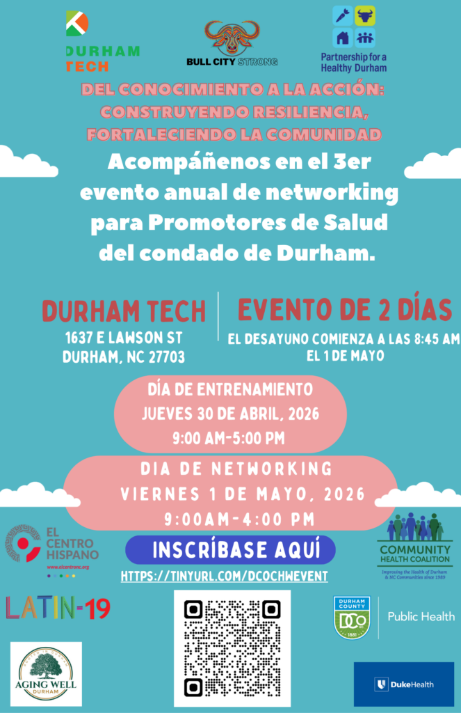 30 de abril y 1 de mayo – 3er Evento Anual de Redes para Promotores de Salud del Condado de Durham. Acompáñanos al 3er Evento Anual de Redes para Promotores de Salud del Condado de Durham. Esta es una celebración de dos días y una oportunidad para que los Promotores de Salud (o roles similares), ya sean remunerados o voluntarios, establezcan contactos y aprendan. Este año, el evento se llevará a cabo en Durham Technical Community College. El jueves 30 de abril (Día 1) será de 9:00 a.m. a 5:00 p.m. y el viernes 1 de mayo (Día 2) de 9:00 a.m. a 4:00 p.m. El desayuno comenzará a las 8:45 a.m. Este año nuestro tema es: Del Conocimiento a la Acción: Construyendo Resiliencia, Fortaleciendo la Comunidad.