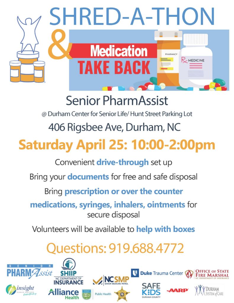 Saturday, April 25th: 10am-noon – It is time for the Shred-A-Thon and Medication Take Back at Senior PharmAssist (406 Rigsbee Ave). Bring your documents that need to be safely disposed of and medication you no longer need. Volunteers will be available to help with boxes. If you have questions, please call 919-688-4772.