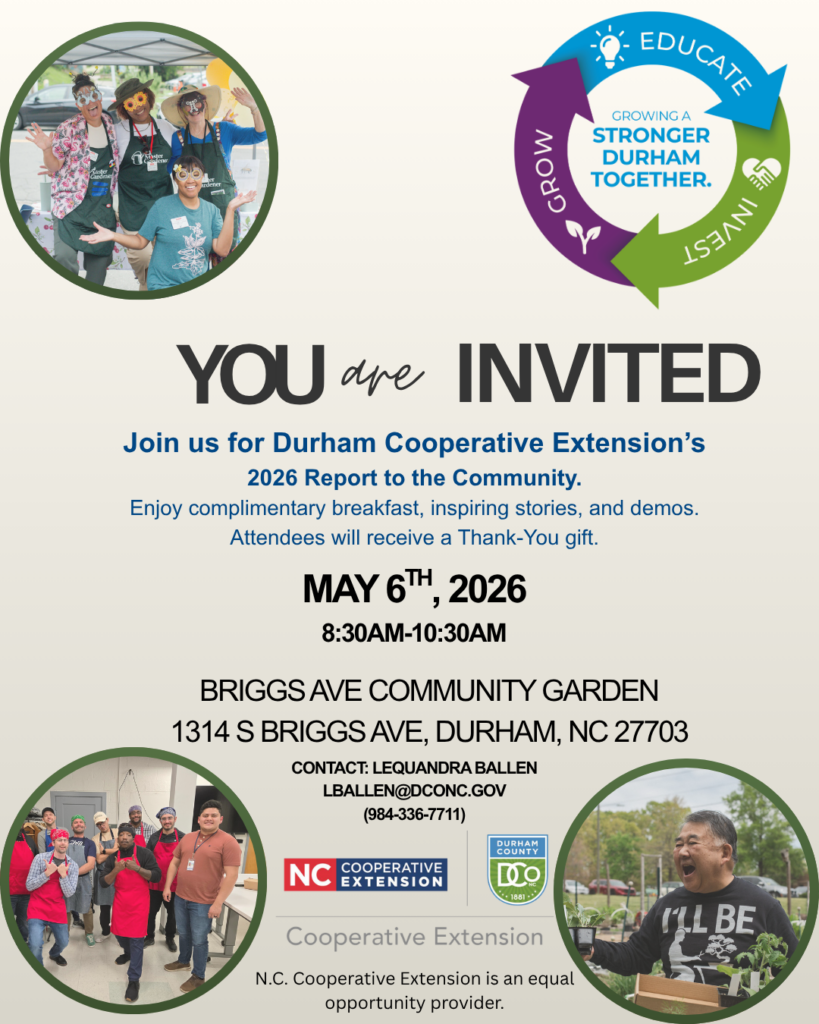 Wednesday, May 6th: 8:30-10:30am – You are invited to Durham Cooperative Extension’s 2026 Report to the Community at the Briggs Ave Community Garden (1314 S. Briggs Ave.). There will be a complimentary breakfast, stories, demos and every guest will receive a gift. Please be sure to register in advance at – https://www.eventbrite.com/e/durham-cooperative-extension-report-to-the-community-2026-tickets-1987411371913?aff=oddtdtcreator. For more information, contact Lequandra Ballen at lballen@dconc.gov or 984-336-7711. Because the event will be outdoors, wearing comfortable shoes and having an umbrella are recommended.